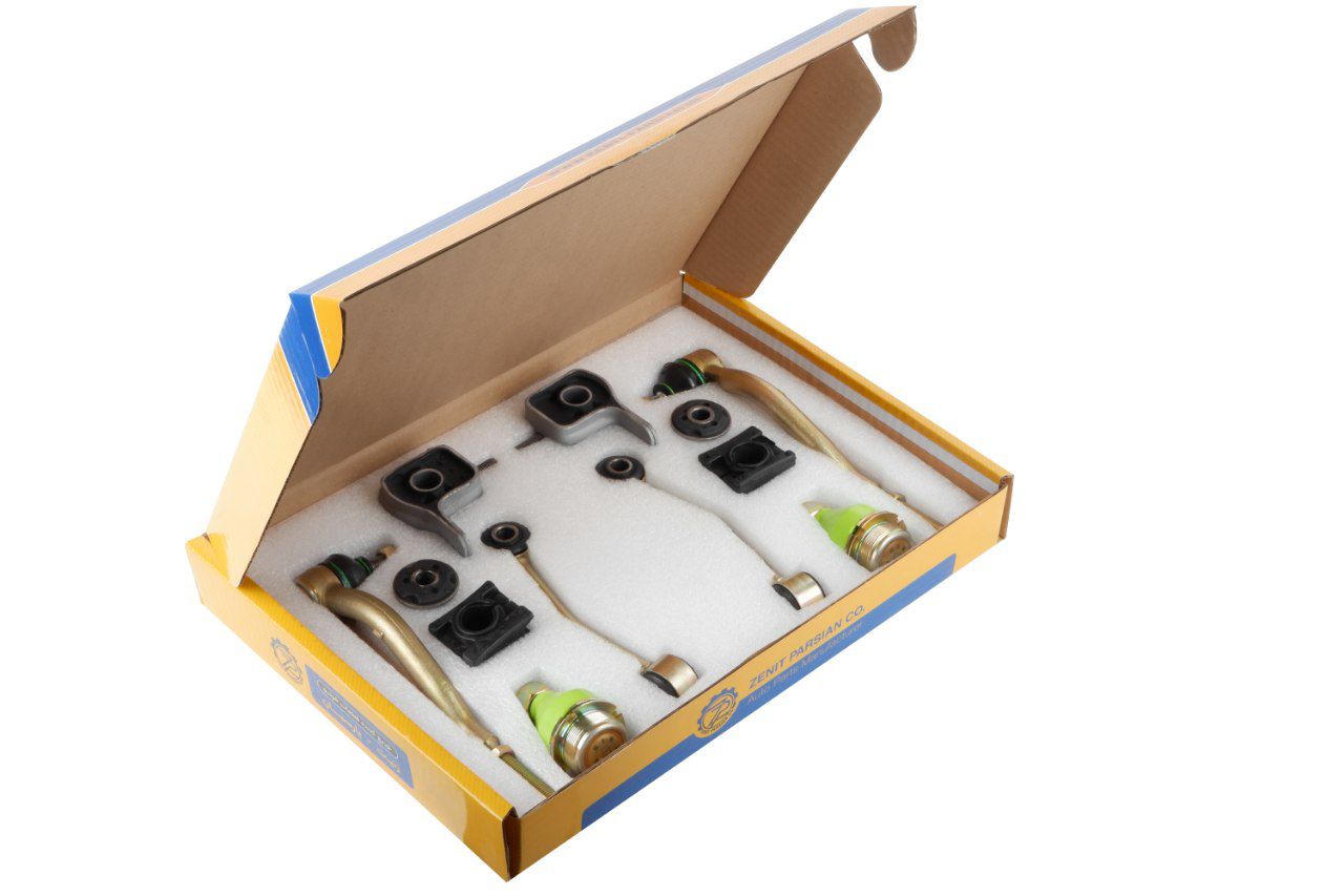 2 عدد بوش طبق جناقی ، 2 عدد بوش طبق لبه دار ، 2 عدد سیبک (چپقی) فرمان ، 2 عدد میل موجگیر(تعادل) پژویی ، 2 عدد سیبک زیر کمک و 2 عدد لاستیک چاکدار